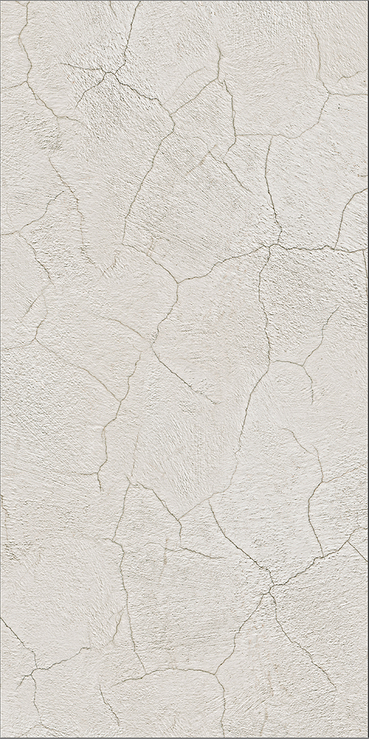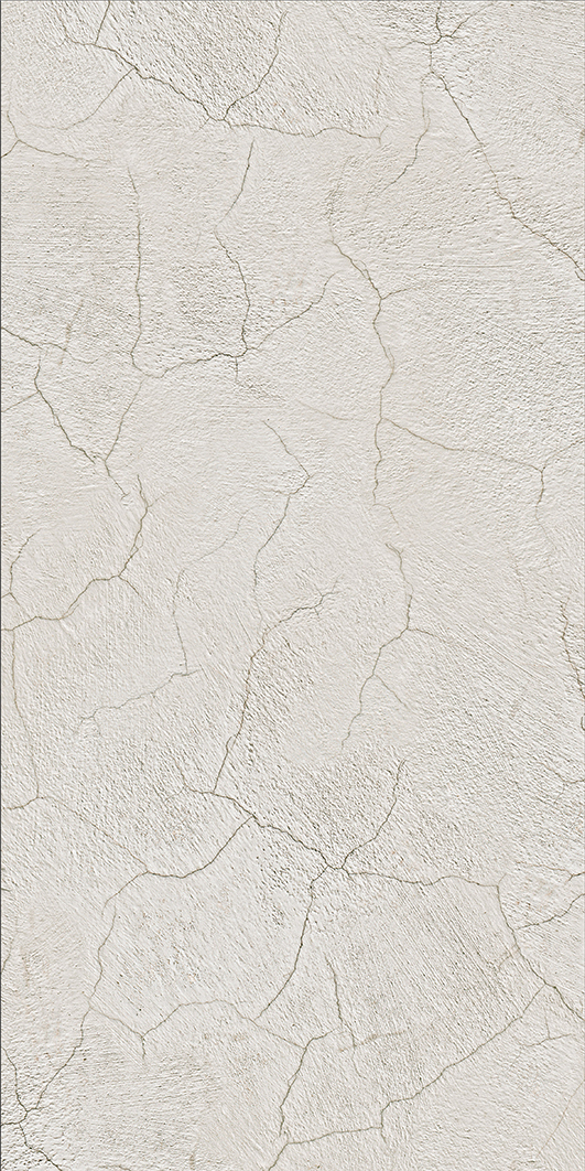 A photograph of a textured, cracked white plaster wall showcasing a weathered, rustic appearance with uneven, jagged cracks spreading across the surface. The overall look is worm and aged, suggesting an old historic building.