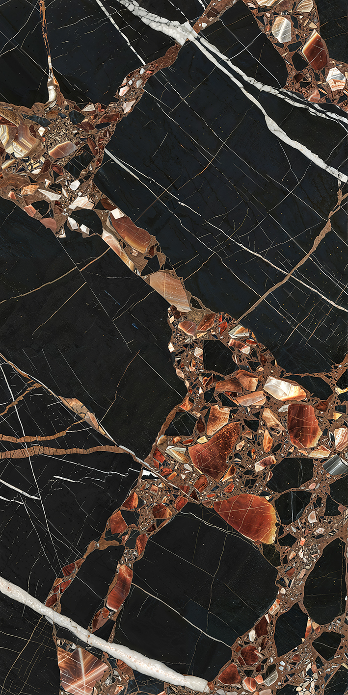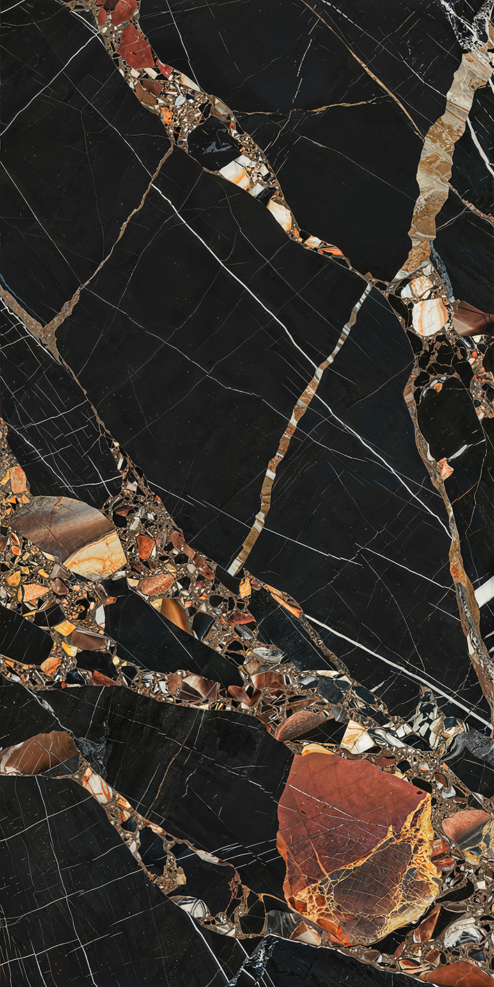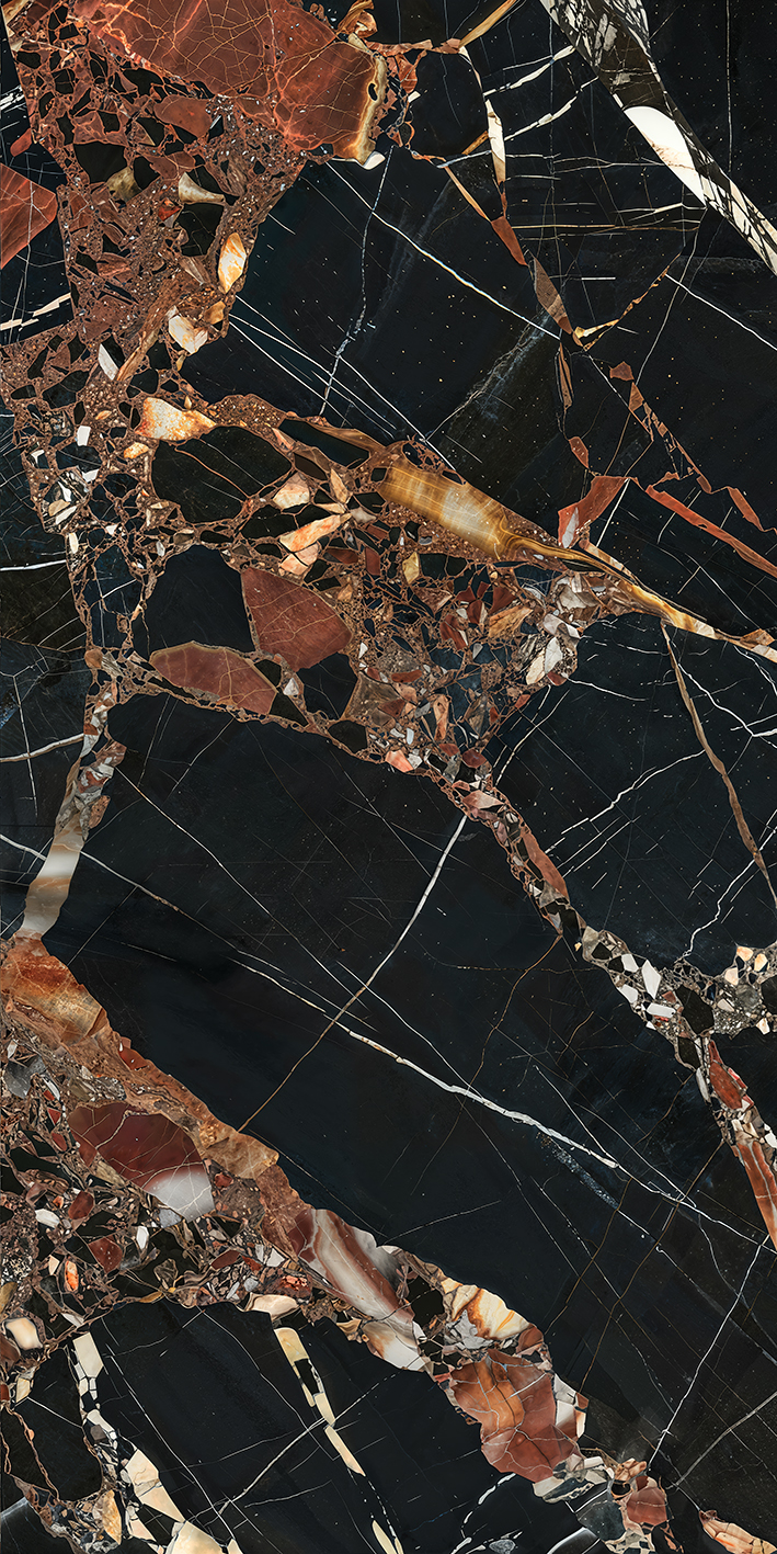 A photograph of a marble countertop featuring a rich black background with intricate patterns of white veins, interspersed with reddish-brown and amber streaks. The texture is smooth with a polished finish, showcasing natural stone beauty and elegance.