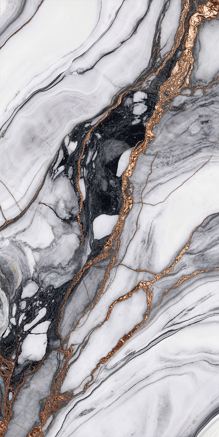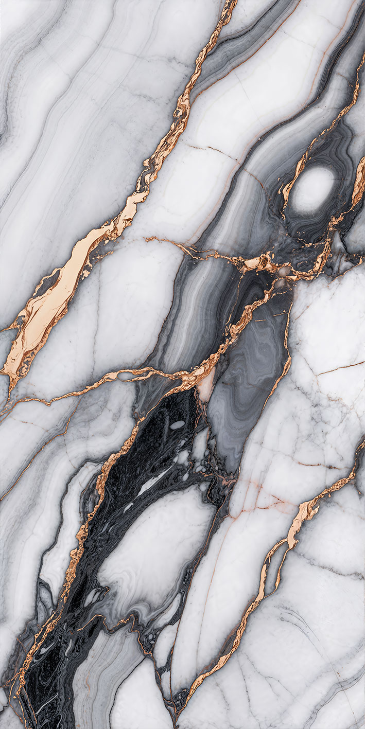 Photograph of a marble surface with intricate, swirling patterns in white, black, and gold, resembling fluid and organic shapes.