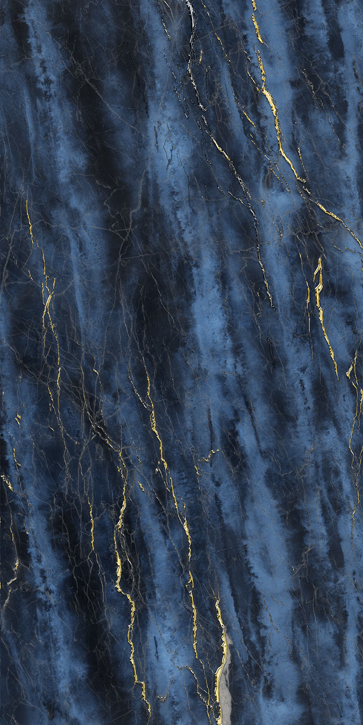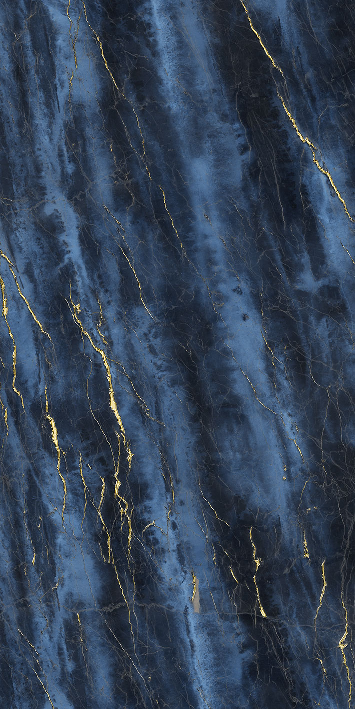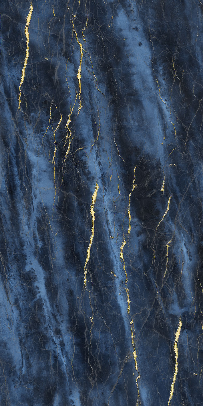 Photograph of a marble surface with dark blue and black veining, accented by golden streaks. The texture appears smooth and polished, giving a luxurious, elegant appearance.