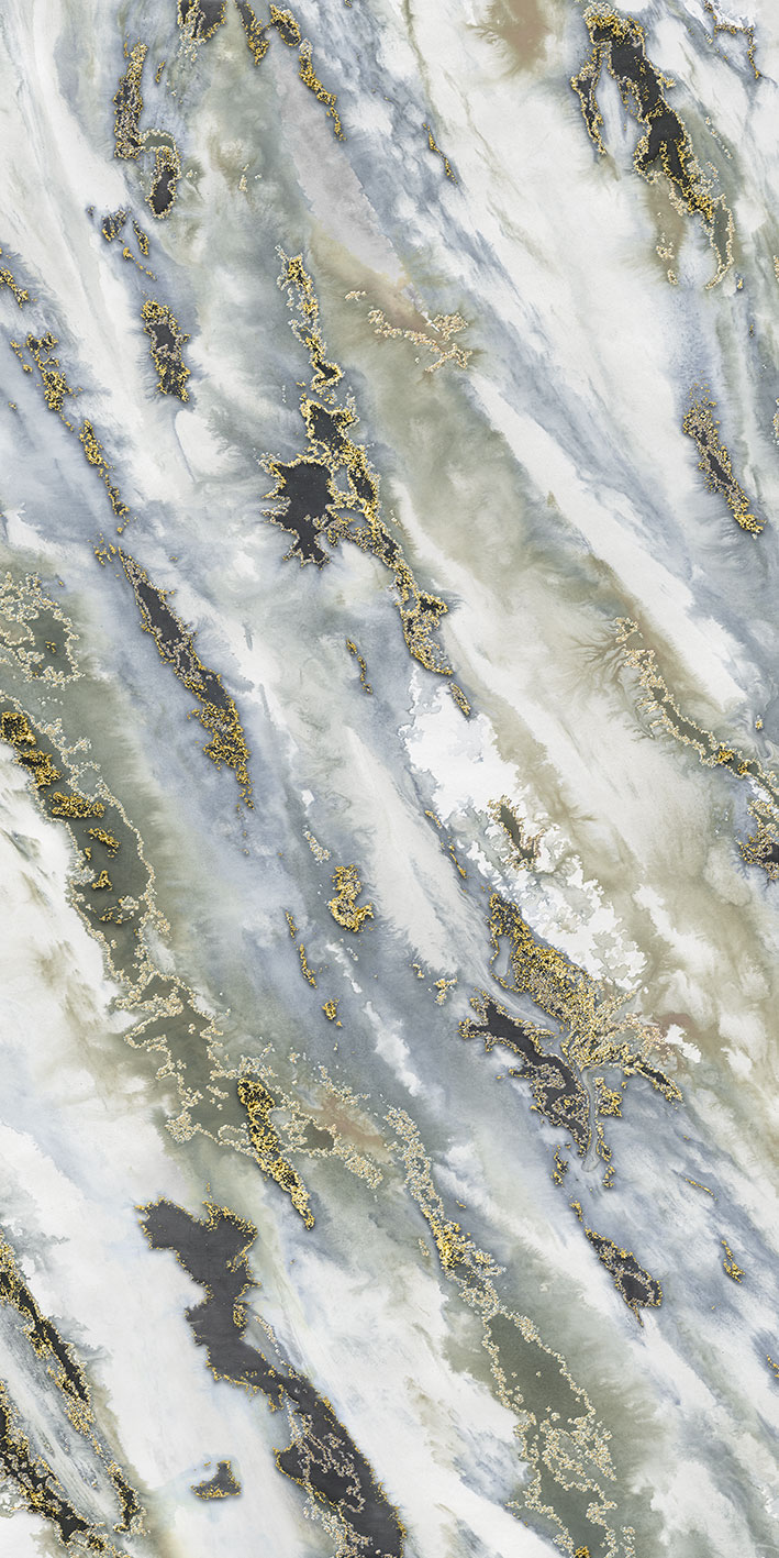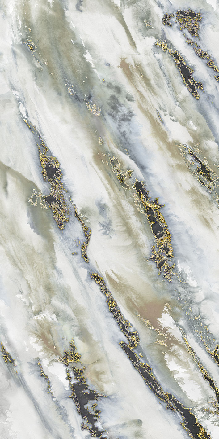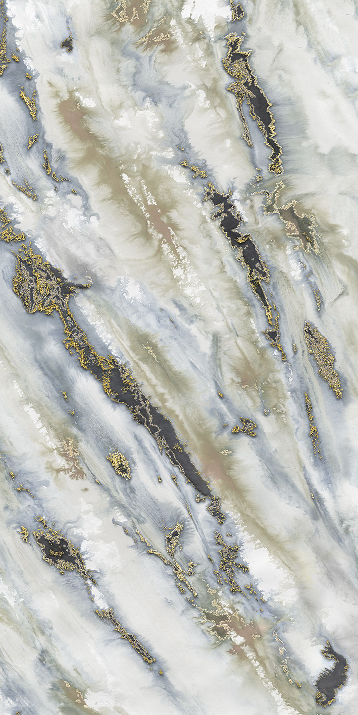 A photograph of marbled stone, featuring swirling patterns of white, grey, black, and gold, creating a luxurious, abstract design. The texture is smooth with intricate veining and a polished finish.